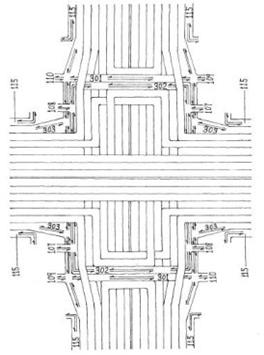 開放型人行道115進入路口前讓位于電動車道。縱向電動車道301人行道302位于兩端路面橋上的橫向掉頭車道與縱向高架車道的中間,兩端分別穿越右轉(zhuǎn)彎車道(高度以電動車行人順利通過為宜)。人行道出入口107、108跨越電動車道,人行道出入口107-108之間(橫向)為地下通道穿越各縱向車道(高度以電動車行人順利通過為宜)。電動車道出入口109-110之間(橫向)為地下通道,穿越人行道入口107、108和各縱向車道(高度以電動車行人順利通過為宜)。