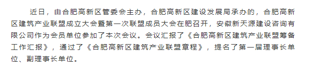 祝賀安徽新天源建設咨詢有限公司入選合肥高新區(qū)第一屆建筑產業(yè)聯(lián)盟