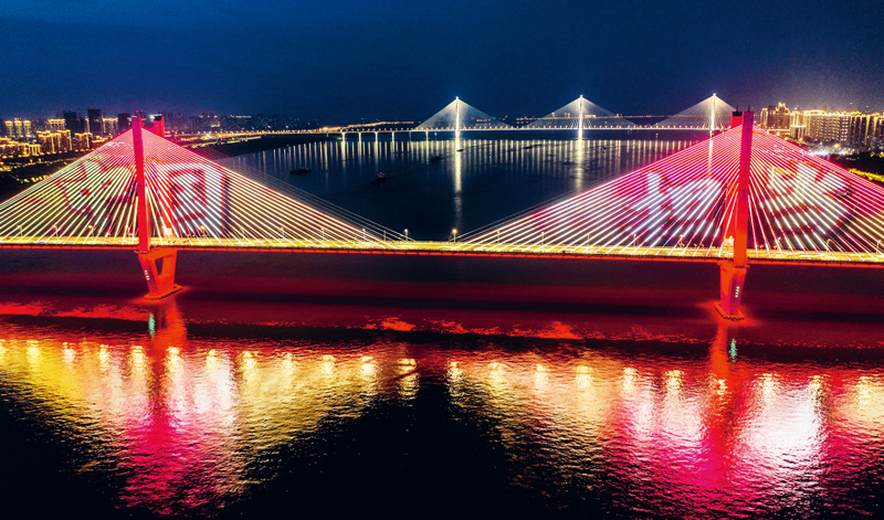 在抗擊新冠肺炎疫情的斗爭(zhēng)中,中國(guó)人民萬(wàn)眾一心、眾志成城,凝聚起強(qiáng)大合力,展現(xiàn)了中國(guó)力量、中國(guó)精神、中國(guó)效率。圖為2020年5月2日晚,湖北武漢長(zhǎng)江二橋燈光秀打出的“中國(guó)擔(dān)當(dāng)”畫(huà)面。 中新社發(fā) 趙廣亮/攝