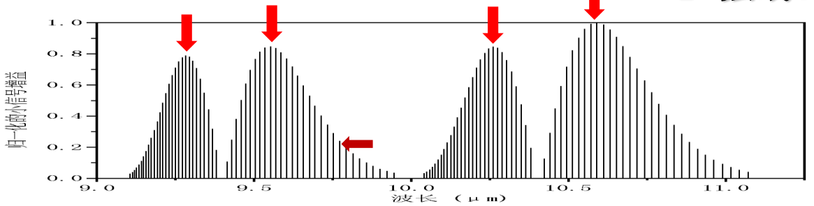 通常CO2激光器波長是10.59mm,這只是CO2激光增益譜中最強(qiáng)的一條譜線。從圖2-3 CO2激光器的譜線圖中可以看出,實(shí)際上有四條譜線的增益都比較大,分別為10.59mm、10.25mm、9.55mm及9.27mm。以上四條譜線為各支的強(qiáng)線。但是在很多應(yīng)用需求中,除輸出這四條強(qiáng)線外還要求輸出某些增益很低的弱線,且實(shí)際應(yīng)用中還需要很高的光束質(zhì)量,因此有較大的研制難度。