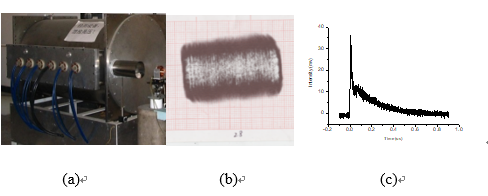 我們研制的高重復(fù)頻率TEA CO2激光器,如圖3-3(a)所示,輸出波長10.6 μm,單脈沖能量可達(dá)15 J,重復(fù)頻率可達(dá)150 Hz,平均功率達(dá)到2250 W。圖3-3中(b)、(c)分別為該激光器的光斑形狀及脈沖波形。該激光器光斑形狀方正,能量分布均勻,并具有較高的峰值功率。
