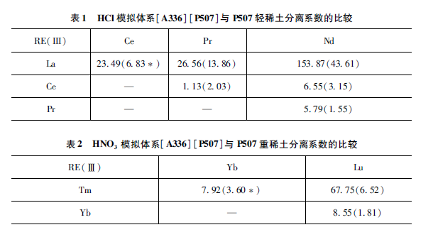 P507(III)萃取稀土按照正序萃取,遵循“四分組效應(yīng)”,稀土的分配系數(shù)隨著原子序數(shù)的增加而增大,而堿性萃取劑[A336]C1在HN03體系中通過陰離子交換萃取稀土是倒序萃取,稀土的分配系數(shù)隨著原子序數(shù)的增加而減小。兩種效應(yīng)共同作用,導(dǎo)致[A336 ] [ P507 ]分離稀土選擇性增強(qiáng),相鄰元素間的分離系數(shù)明顯提高。同時(shí),陽離子[A336]+和陰離子[P507 ]-的離子半徑大,空間位阻增加,也有助于提高稀土(III)的萃取選擇性。模擬實(shí)際體系的組分混合物,在HCl體系中在輕稀土間的分離系數(shù)也有較大的提高,尤其是Pr/Nd分離系數(shù)5. 79明顯高于P507體系的1. 55(徐光憲主編,《稀土》,第二版,1995 ) ,見表1。在HN03體系中重稀土Tm/Yb/Lu的分離系數(shù)較大,明顯高于目前的P507體系(李德謙等,中國發(fā)明專利,ZL200510016682. 6 ),見表2。[A336 ] [P507 ]的特殊結(jié)構(gòu)對部分稀土離子分離的選擇性方面比較突出,與其較大的空間位阻有關(guān)。