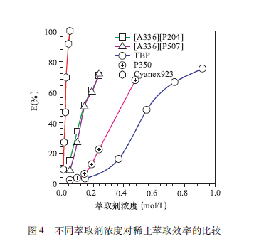 相同條件下在硝酸體系中萃取能力順序比較:TBP(磷酸三丁醋)< P350(甲基磷酸二甲庚醋)< [A336] [P507] < Cyanex923(圖4)。盡管Cyanex923是萃取稀土的優(yōu)良萃取劑,但成本比較高,且難以國產(chǎn)化,實(shí)際應(yīng)用中還是受到一定的影響。[A336 ] [ P507」的優(yōu)勢還體現(xiàn)在酸堿消耗低,反萃取完全。