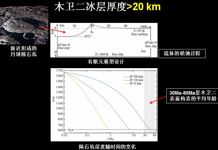 冰層厚度很重要:厚的冰層可能發(fā)生對流,有利于表面與水的連通;過薄的冰層不利于對流的發(fā)生,限制了表面與水的連通。動力學(xué)數(shù)值模擬揭示:木衛(wèi)二冰層厚度大于20km。